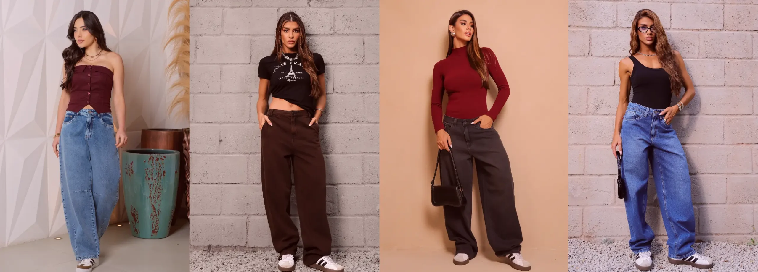 Ou pense numa campanha com influenciadoras locais vestindo diferentes versões de baggy – recortes, pregas, lavagens claras. Essas fotos também podem se tornar base para layout de loja, posts e vitrines temáticas.