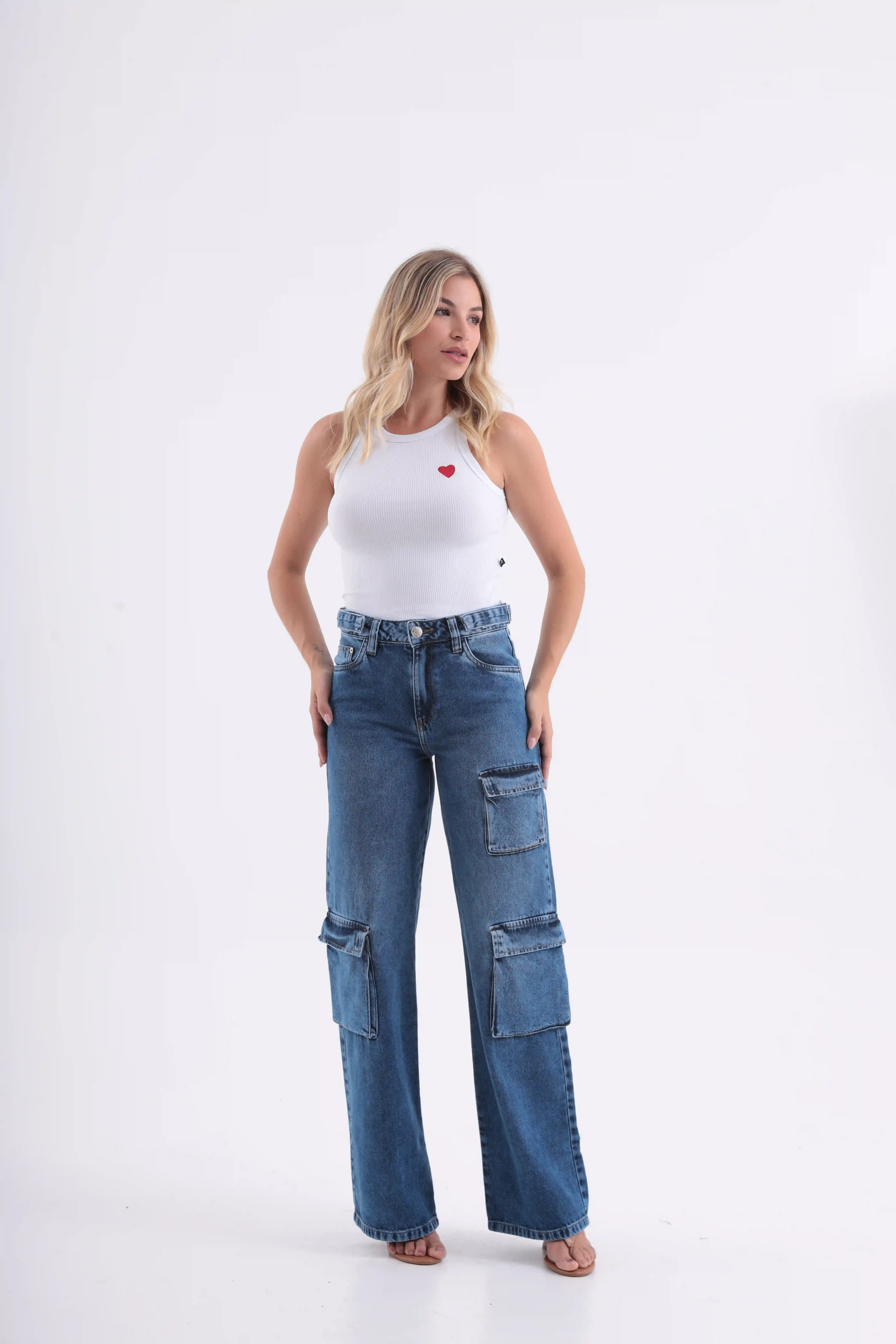 Calça jeans wide leg cargo Belize