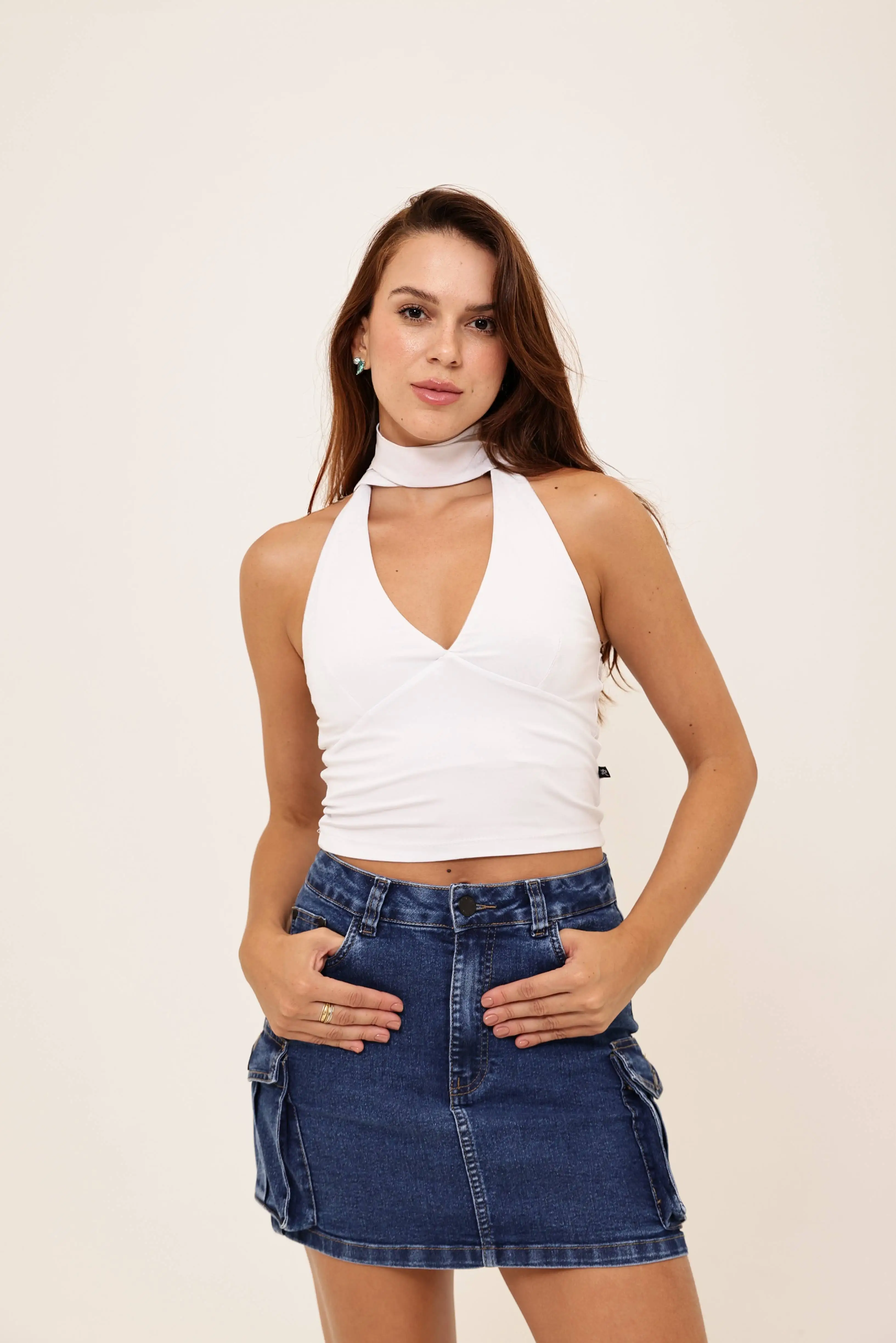 A mini saia jeans com bolso cargo Geovanna combina estilo urbano e funcionalidade. O detalhe dos bolsos traz referência utilitária, tendência forte no varejo.