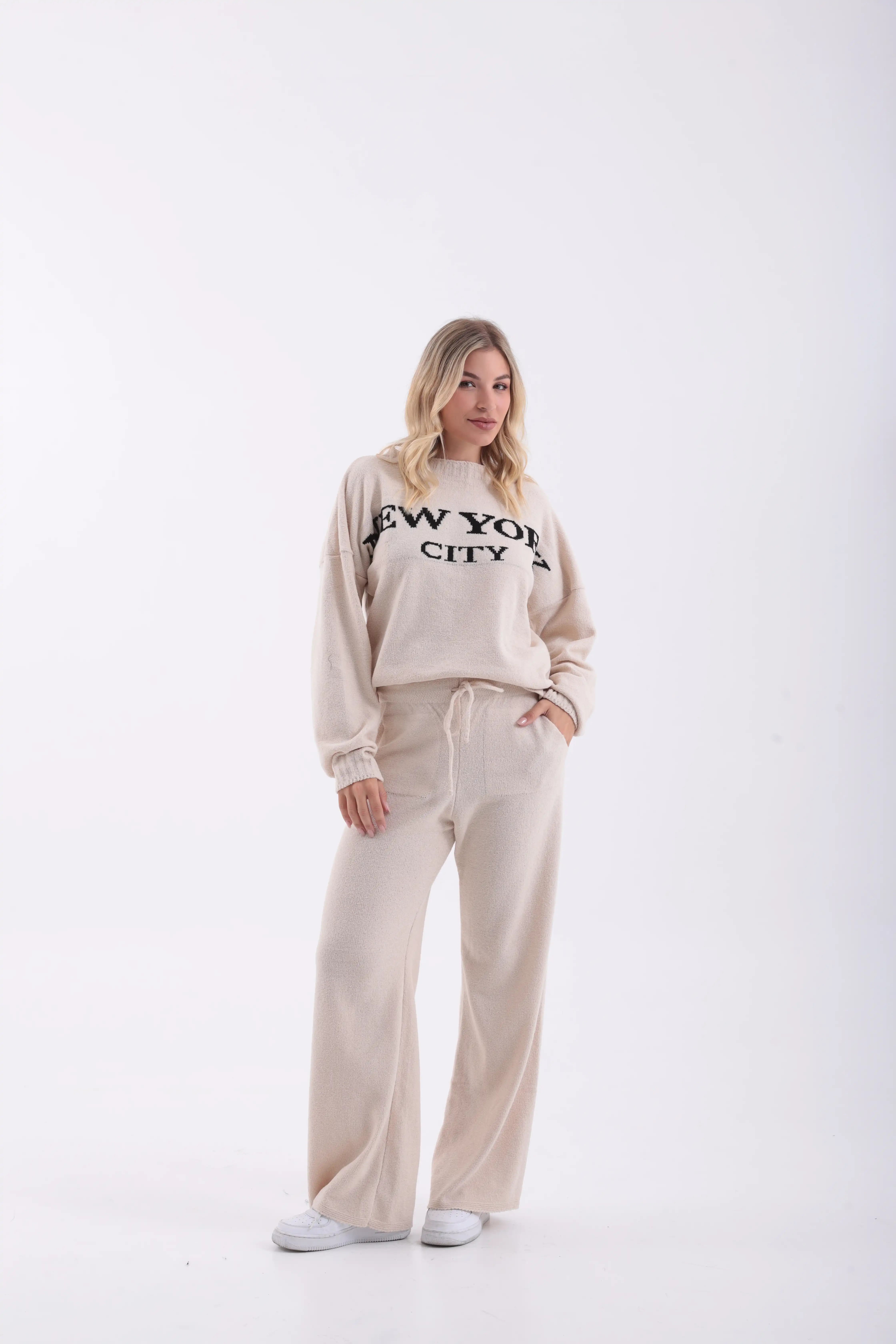 A calça wide leg de tricot une tendência e conforto. A modelagem ampla continua em alta. Além disso, o tecido proporciona sensação agradável ao uso. Essa peça representa bem o conceito das roupas de outono/inverno 2026.