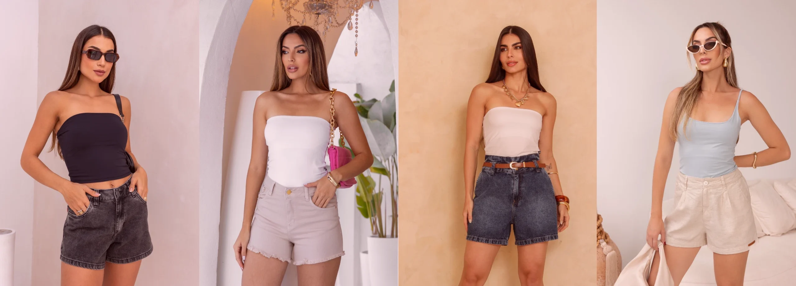 Use visuais inspiradores: exiba os shorts acompanhados de tops leves, chapéus e sandálias para mostrar combinações reais. Os vitrinistas devem ressaltar os detalhes das peças – barras, lavagens, recortes.