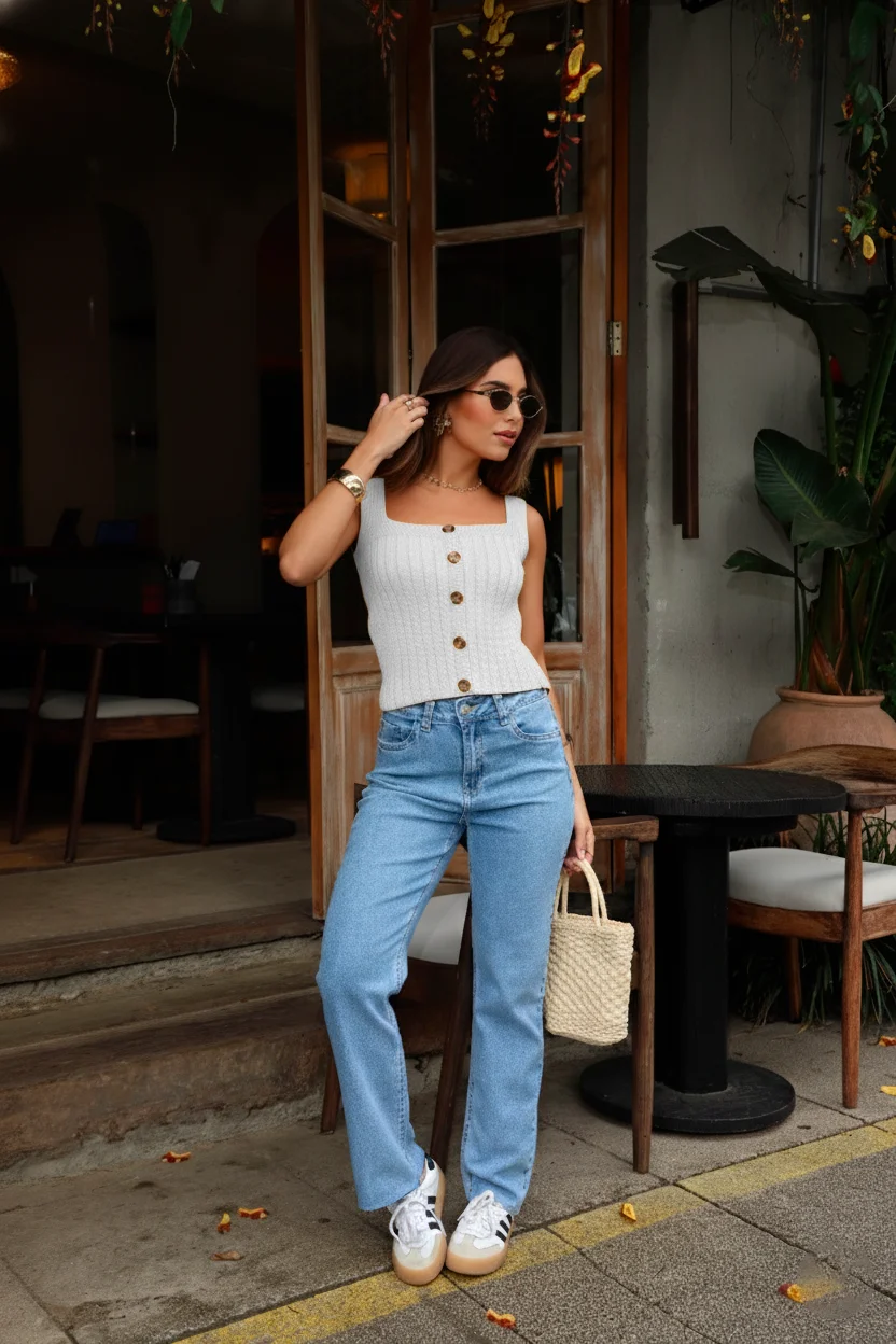 Mesmo nos dias quentes, o tricot leve continua em alta. A blusa Aisne traz um decote quadrado que valoriza o colo e botões que enriquecem o design. Uma peça curinga para o guarda-roupa de verão.